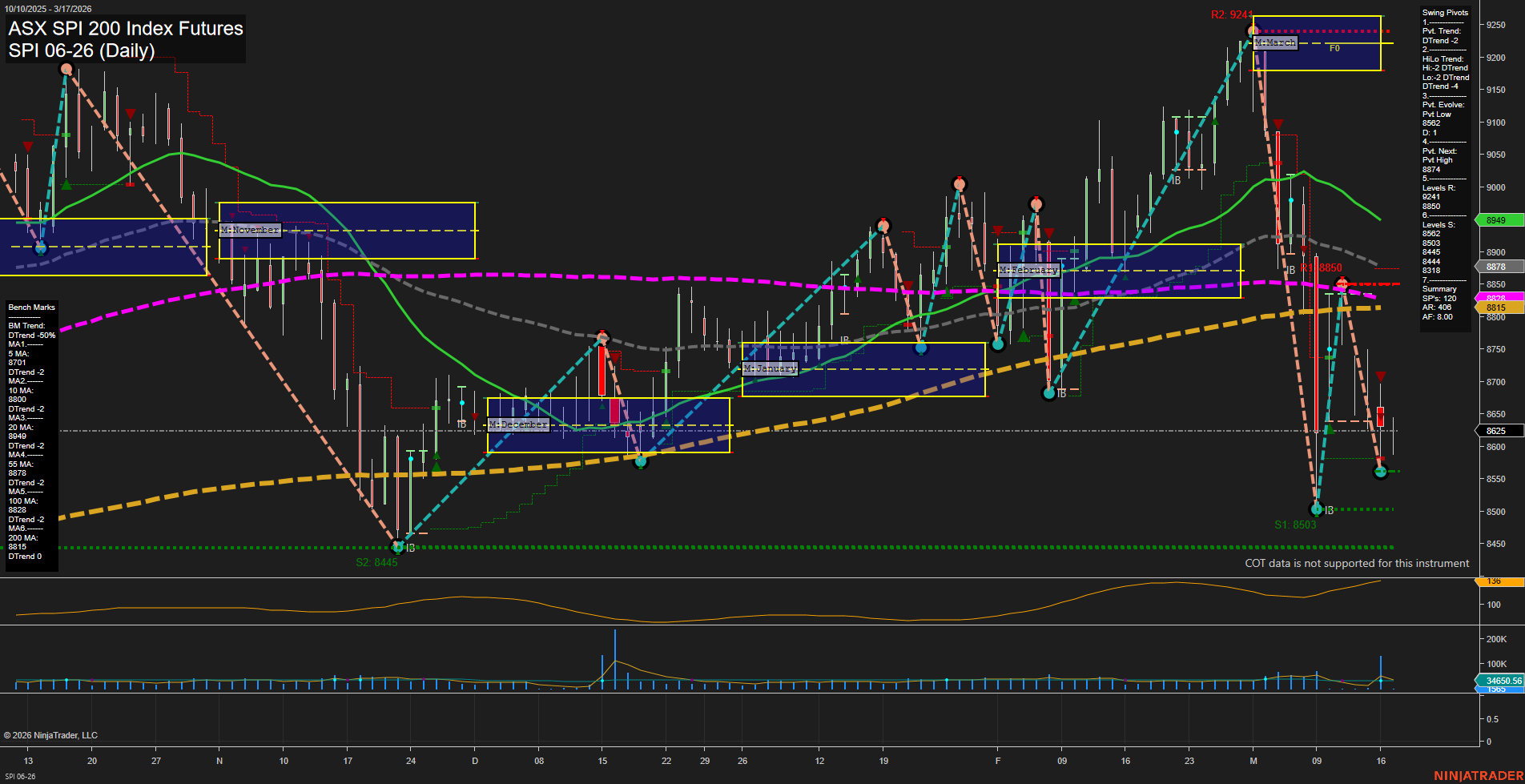 The SPI 200 futures are exhibiting pronounced downside momentum, with large bars and fast-moving price action confirming a strong bearish environment. All benchmark moving averages across short, intermediate, and long-term horizons are trending down, reinforcing the prevailing negative sentiment. Swing pivot analysis shows both short-term and intermediate-term trends are in a downtrend, with the most recent pivot low at 8503 and the next potential reversal at 8874. Resistance levels are stacked above current price, while support is relatively close, suggesting limited downside buffer. Volatility remains elevated (ATR 96), and volume is robust, indicating active participation during this selloff phase. The market is in a corrective or liquidation phase following a failed rally in early March, with no clear signs of reversal or stabilization yet. The technical landscape points to continued caution as the market searches for a durable support base.
